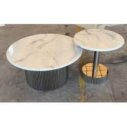 Set elegant de măsuțe cu blat din marmură compozită și bază metalică texturată – un duo sofisticat pentru un living contemporan.