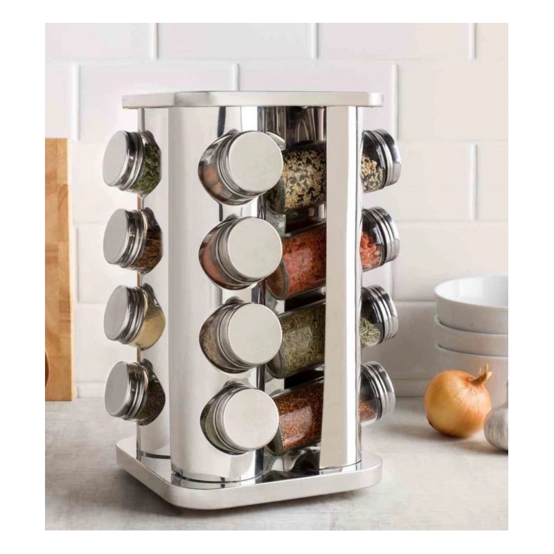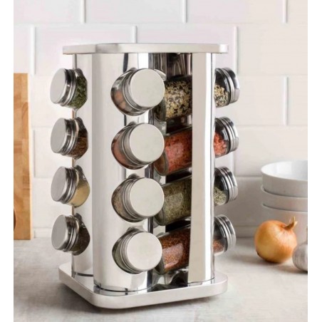 Suportul rotativ din inox cu design modern este prevăzut cu 16 borcane din sticlă cu capace metalice, perfecte pentru păstrarea în siguranță a tuturor mirodeniilor și ierburilor aromatice preferate.