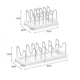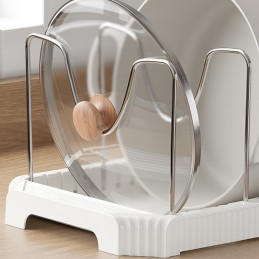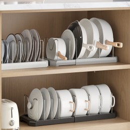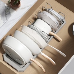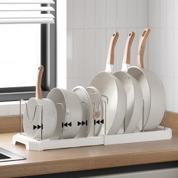 Acest suport extensibil este soluția ideală pentru depozitarea ordonată a tigăilor, oalelor și capacelor, economisind spațiu și oferind un aspect modern blatului de bucătărie.
