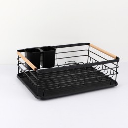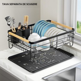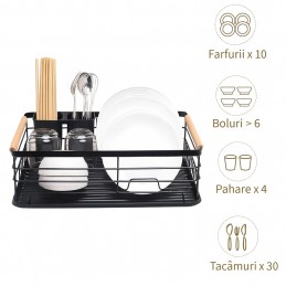 Adu ordine și eleganță în bucătăria ta cu acest scurgător de vase modern și rezistent, realizat din metal negru cu finisaj mat și mânere din lemn natural. Designul său minimalist și funcțional se potrivește perfect în orice stil de bucătărie, oferind atât utilitate, cât și rafinament.