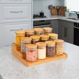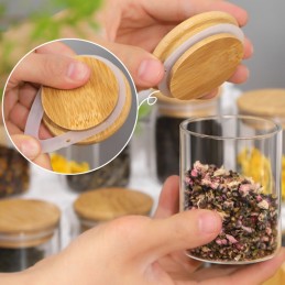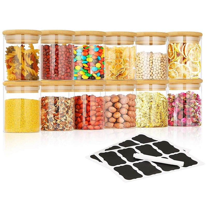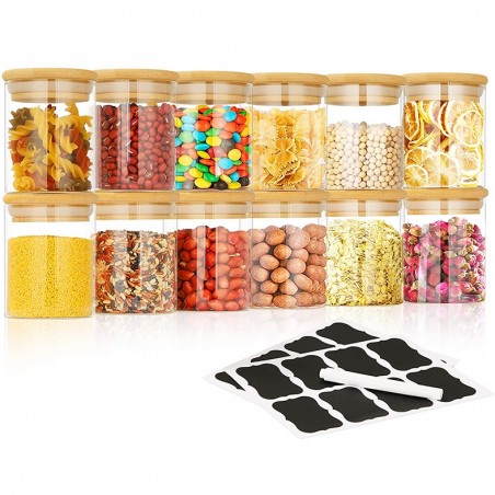 Acest set de 12 recipiente din sticlă cu capace din bambus elegant aduce un aer natural și armonios în bucătăria ta. Perfecte pentru condimente, ceaiuri, cafea, cereale sau fructe uscate, aceste borcane îmbină simplitatea designului cu utilitatea zilnică, oferindu-ți o soluție practică și estetică pentru depozitare și organizare.
