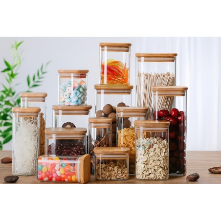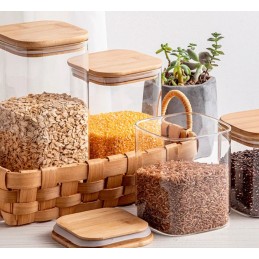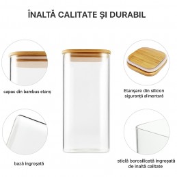 Organizează-ți bucătăria cu stil și funcționalitate! Acest set de recipiente din sticlă borosilicată, cu formă dreptunghiulară și capace din bambus natural, este soluția ideală pentru depozitarea alimentelor uscate, dulciurilor, pastelor, cerealelor, condimentelor și nu numai.