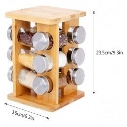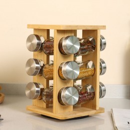 Suport rotativ pentru condimente din bambus cu 12 borcane din sticlă