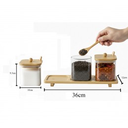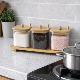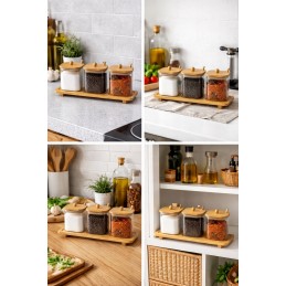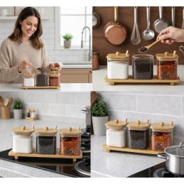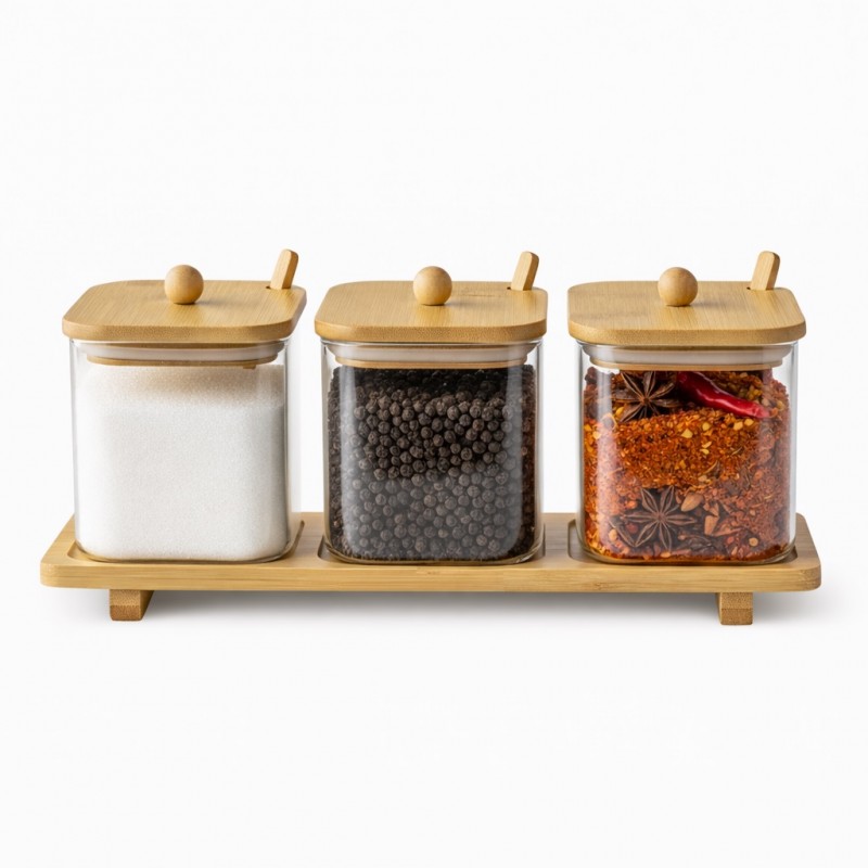 Organizează-ți bucătăria elegant și eficient cu acest set de recipiente pentru condimente, realizat din sticlă borosilicată rezistentă și completat de un suport din bambus natural.
