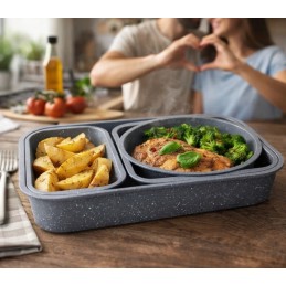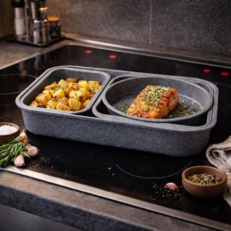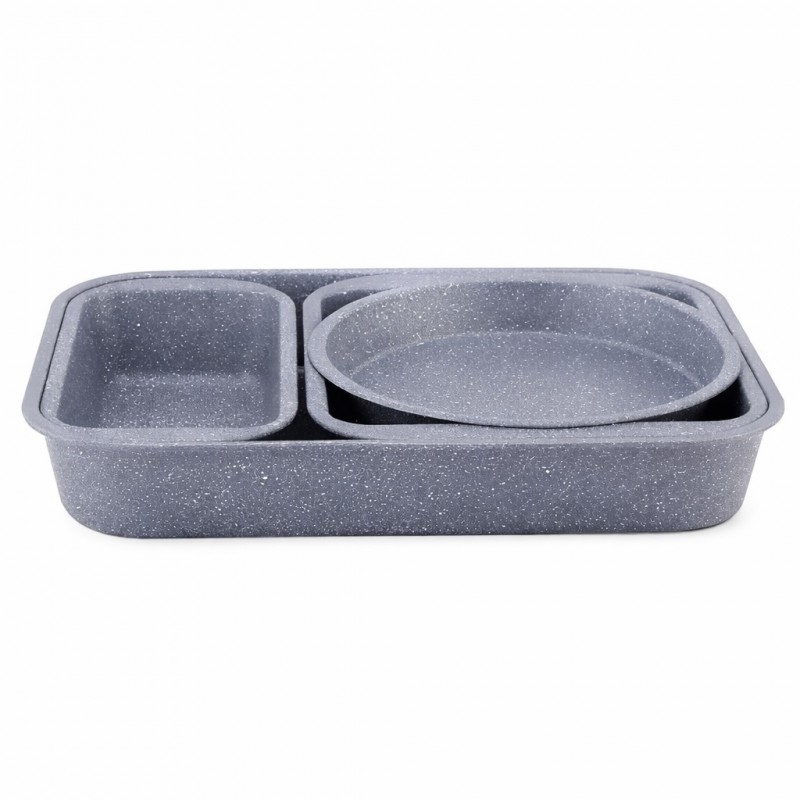 Gătește sănătos și eficient cu setul de 4 tăvi și forme de copt antiaderente cu strat marmorat (stone coating), PFOA Free, special concepute pentru coacere uniformă, fără lipire și curățare rapidă.