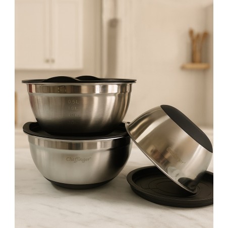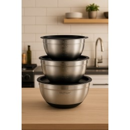 Organizează-ți bucătăria eficient cu acest set de 3 boluri din oțel inoxidabil alimentar, fiecare prevăzut cu capac din plastic etanș si baza de silicon.