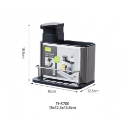 Suport organizator inox pentru chiuvetă cu dispenser detergent și spațiu pentru bureți & perii