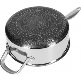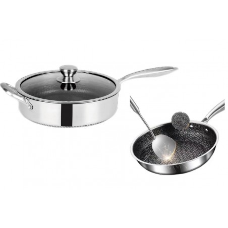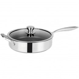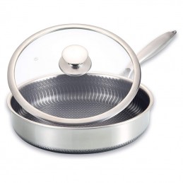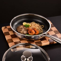 Gătește mai ușor, mai sănătos și mai rapid cu tigaia profesională din oțel inoxidabil de 28 cm, prevăzută cu capac din sticlă termorezistentă și suprafață antiaderentă tip fagure (model hexagonal), special concepută pentru a preveni lipirea alimentelor și pentru a rezista la zgârieturi.