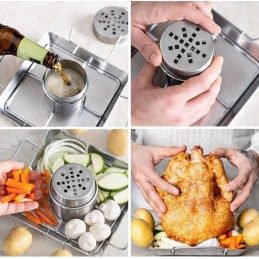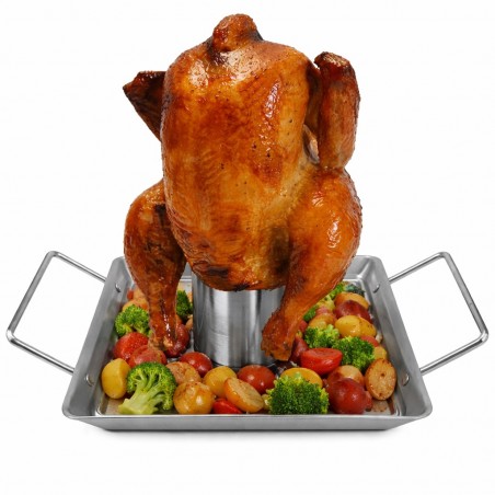 Pregătește rapid un pui crocant și suculent chiar la tine acasă. Acest suport pentru pui la cuptor din oțel inoxidabil permite gătirea verticală pentru o coacere uniformă, iar tava inclusă îți oferă posibilitatea de a prepara în același timp legume sau garnituri delicioase.